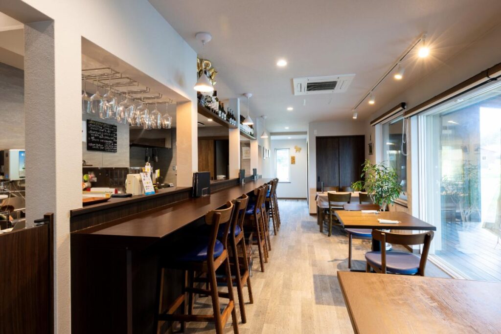 大きなテラス窓が景色を取り込む開放的な店内。3つのテーブル席に加えカウンター席も備えています。