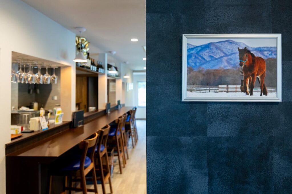 雪景色を背景にした馬の写真がお客さまをお出迎え。
