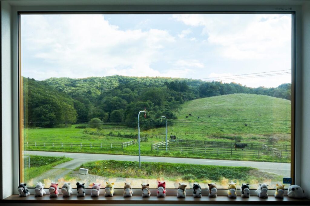 寺浦さん 道路を挟んで馬や牛の放牧が眺められるこの場所を見つけて「ここや!」思うて。前はお隣さんのビニルハウスがあったんやけど、何べんも通って「譲ってほしい」ってお願いしました。そしたら、ええよ、言うてくれて。それからもずっと良くしてもらっています。