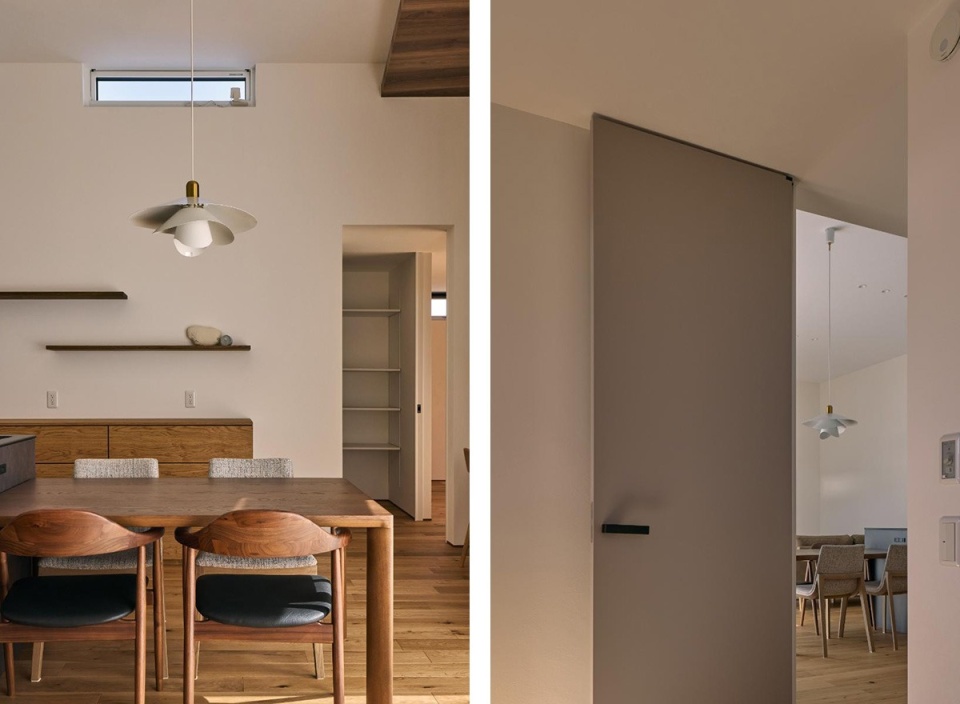 リビングドア(写真左)はLIXIL社の「ラフィス」。壁の厚みの差を使った間接照明(写真右)は吉田社長によるデザインで、昼と夜で異なる魅力を放ちます。