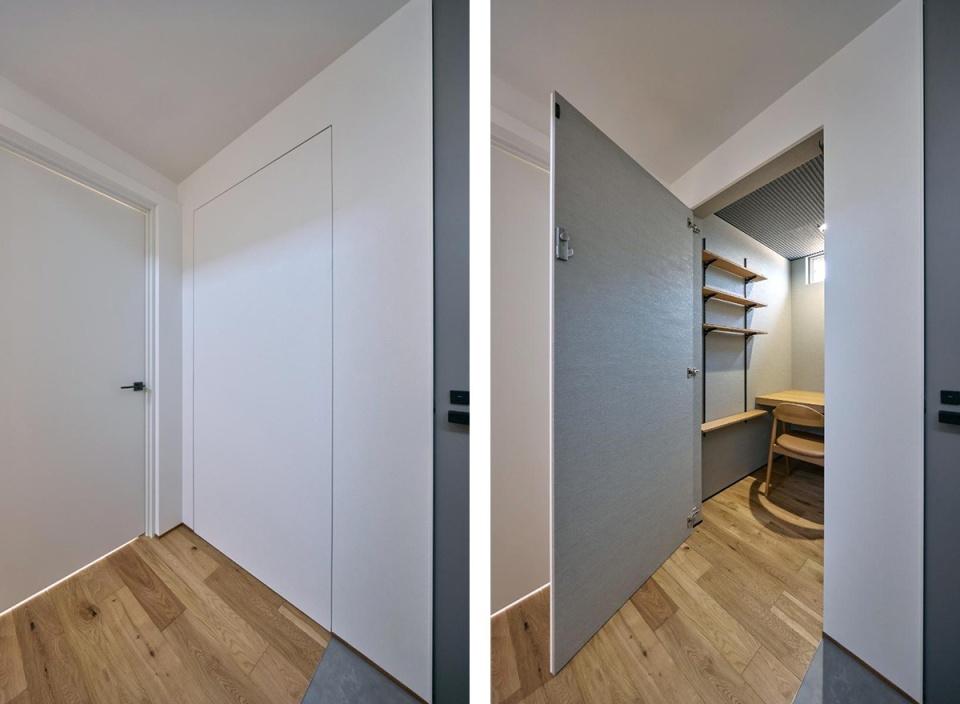 壁だと思って通り過ぎた場所には……なんと隠し部屋が。遊び心をくすぐるこちらの空間はご主人の書斎です。ドアは押すことで開くプッシュラッチタイプで、室内と同じクロスで仕上げています。