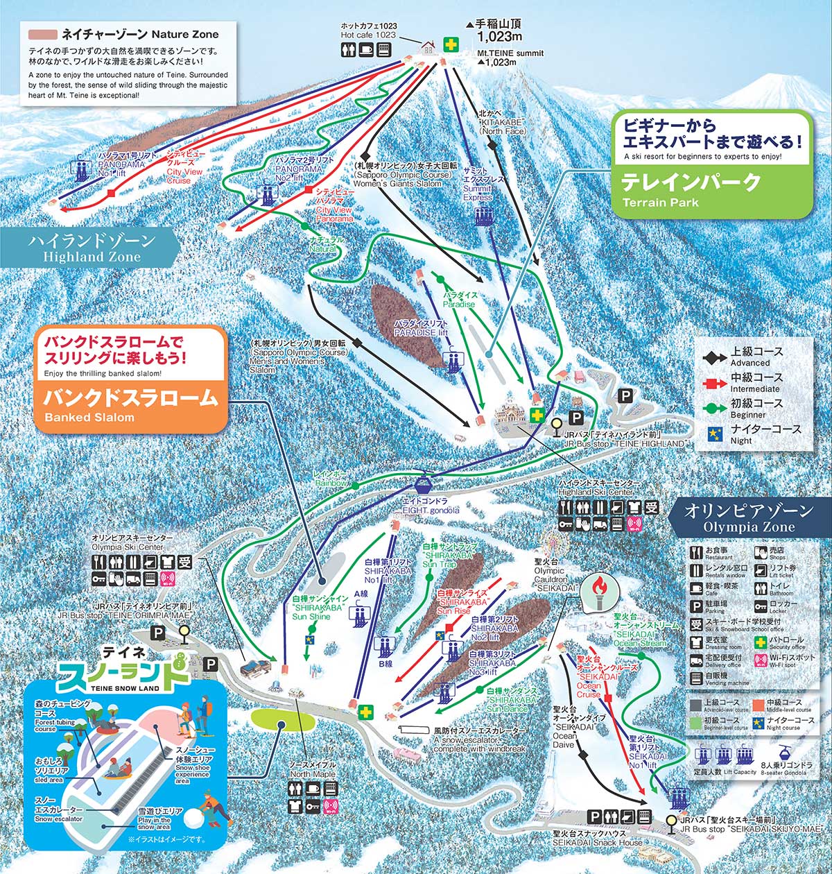 札幌オリンピック(1972年)のアルペンスキー会場ともなり、斜度38度の林間コース(北壁コース)でも有名なテイネ。スキー場はオリンピアゾーンとハイランドゾーンに分かれ、それらをゴンドラが結んでいます。